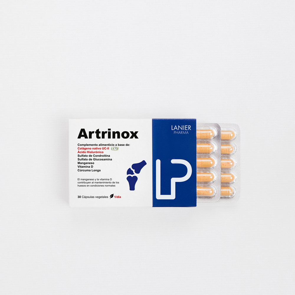En Lanier Pharma hemos formulado Artrinox, un suplemento a base de Colágeno tipo UC-II de última generación, Ácido Hialurónico, Sulfato de Glucosamina, Sulfato de Condroitina, Vitamina D, Manganeso y Cúrcuma. Esta estudiada asociación de ingredientes proporciona una reducción del dolor y la inflamación articular, a la vez que protege el cartílago y otras estructuras articulares.